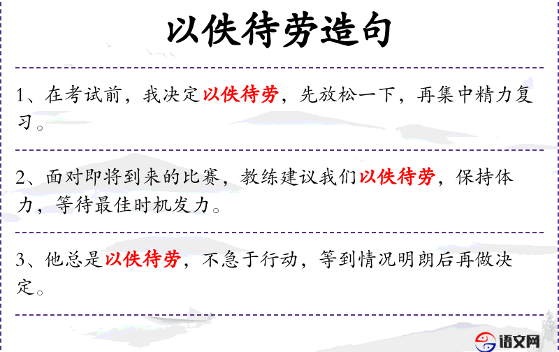- 以佚待劳:指采取轻松的态度等待机会,不急于行动。