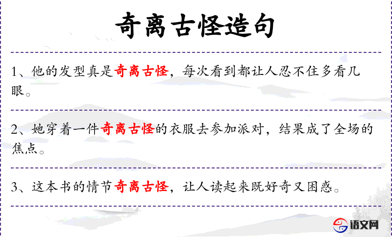 - 奇离古怪:形容词,指想法或行为不寻常、与众不同。