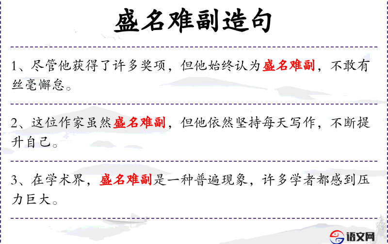 1. 【盛名难副】 盛:大;副:相称,符合。名望很大的人,实际的才德常是很难跟名声相符。指名声常常可能大于实际。用来表示谦虚或自我警戒。