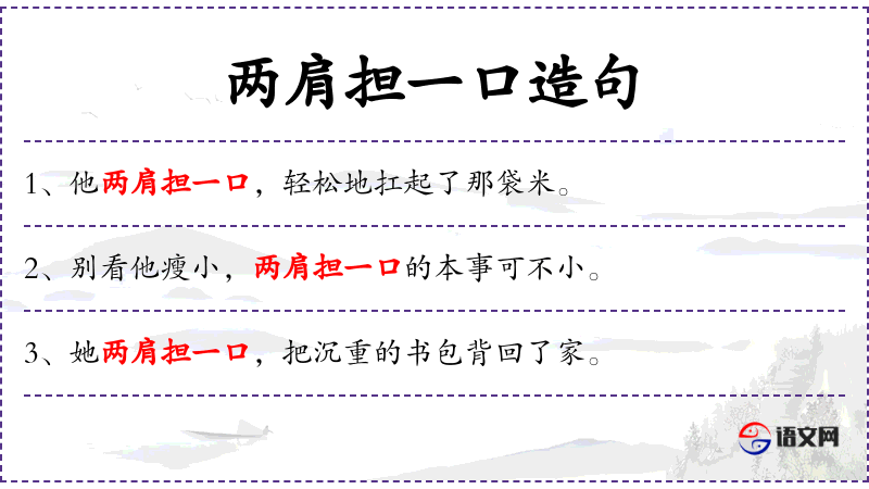 - 英文:Grandpa carried firewood down from the mountain on both shoulders.