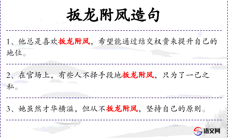 - 扳龙附凤:这个成语反映了**传统文化中对权势的看法,即不依赖他人,而是通过自己的努力取得成功。