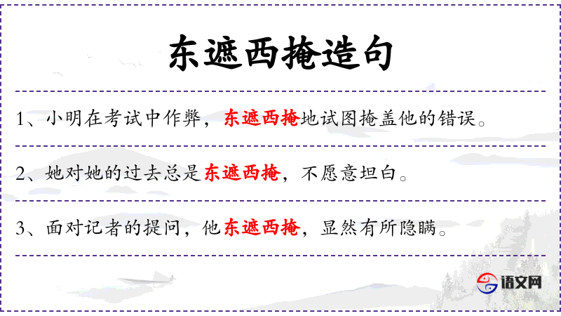 - 小明试图在考试中作弊,并东遮西掩地掩盖他的错误。