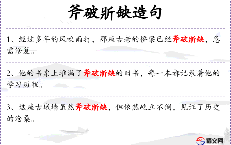 句子:“这座古城墙虽然斧破斨缺,但依然屹立不倒,见证了历史的沧桑。”