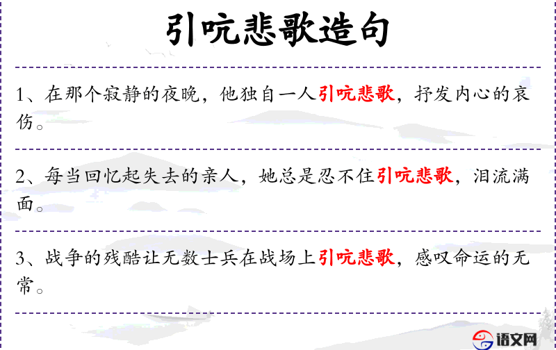 - 引吭悲歌:指大声唱出悲伤的歌曲,表达内心的痛苦。