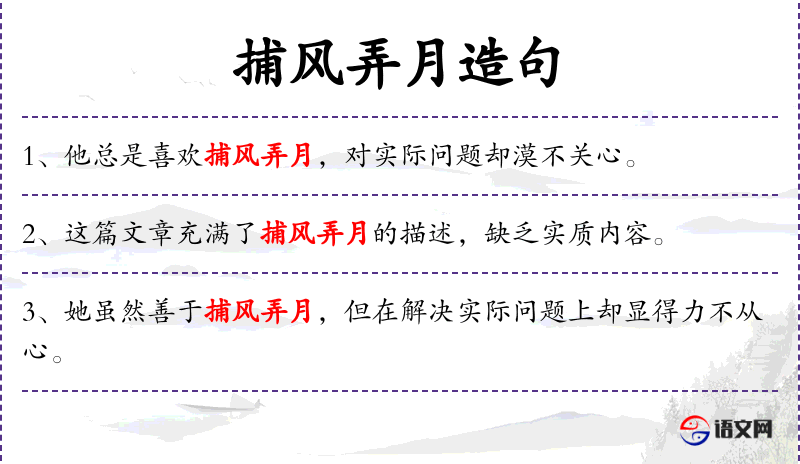 - 文化背景:在**文化中,“捕风弄月”常用来形容文学作品的含蓄和深奥。