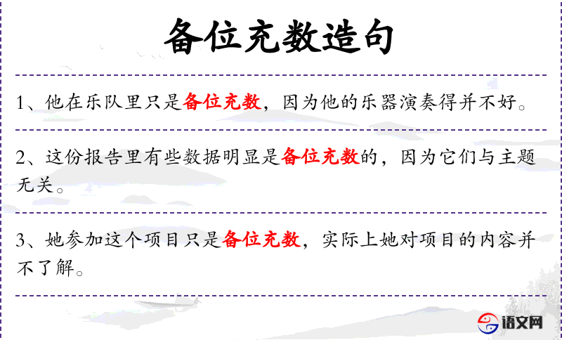 - 备位充数:指为了凑数而添加的,不一定有实际价值或受欢迎的东西。