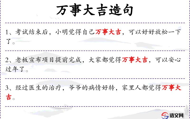 - 相关成语:“万事大吉”是一个常用的成语,表达一切都很顺利。