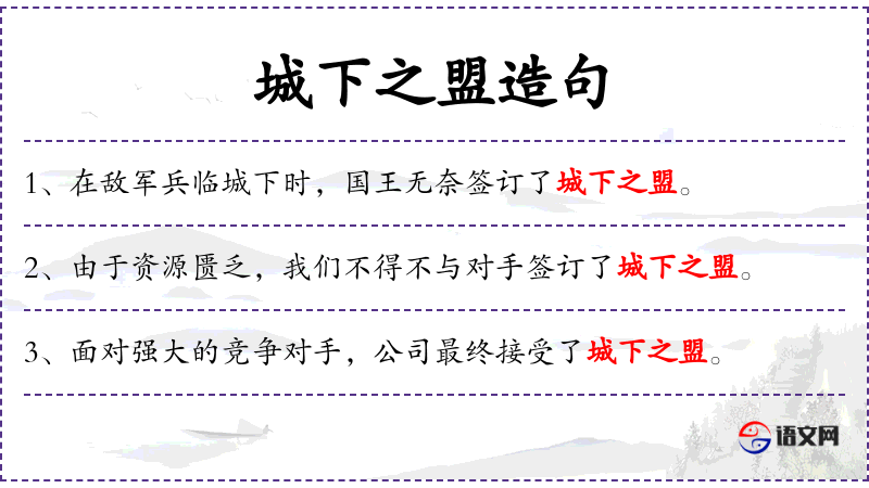 - “在历史上,众多国家因战争被迫签订了城下之盟。”