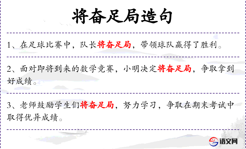 - 将奋足局:可能是一个误用的词汇,正确的应该是“加倍努力”或“全力以赴”