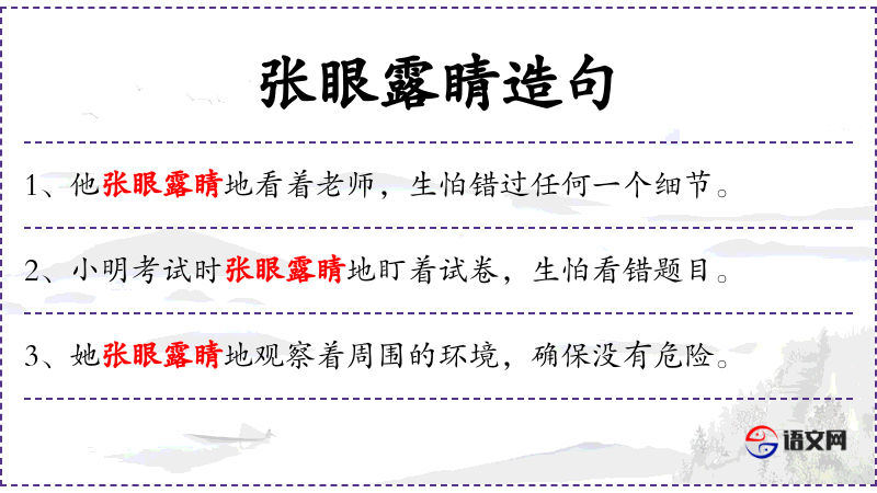 文化意义:在文化中,考试被视为重要的评估和选拔手段,学生通常会对考试非常重视,表现出紧张和专注。 成语/典故**:张眼露睛可以联想到成语“目不转睛”,都表示专注地看。