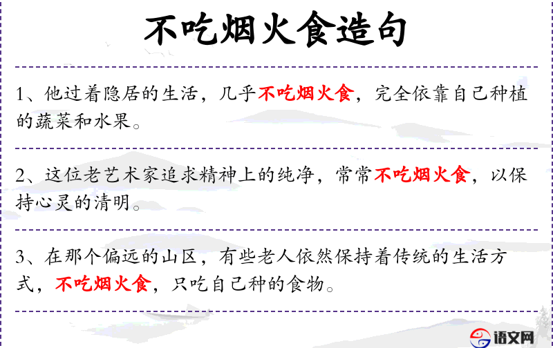 1. 【不吃烟火食】 烟火食:熟食。道教以为仙人可以不吃熟食。旧时用来称赞诗文立意高超,言词清丽,不同一般。