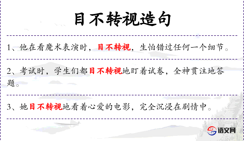 2. 【目不转视】 - 眼珠一转不转。形容注意力集中,看得出神。