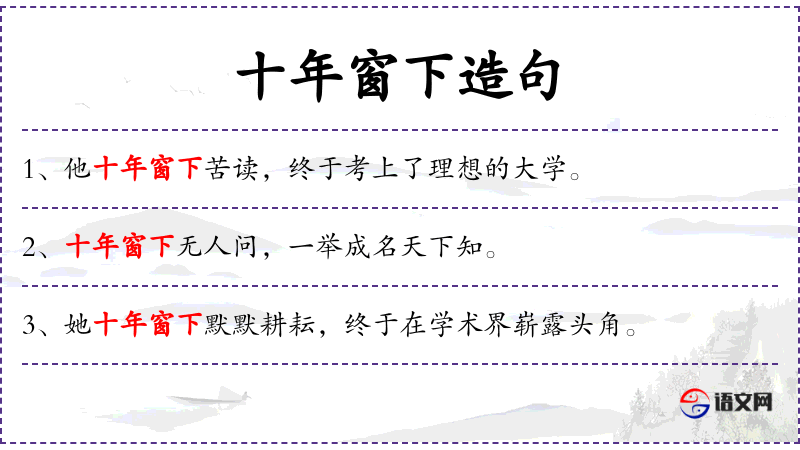 - 十年窗下:这个表达可能源自*古代的科举制度,指的是长期在家中刻苦学,准备科举考试。