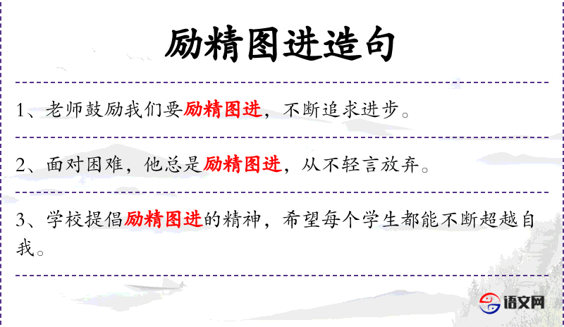 1. 【励精图进】 励精:振奋精神;图:指谋求。挂历精神,力求前进。