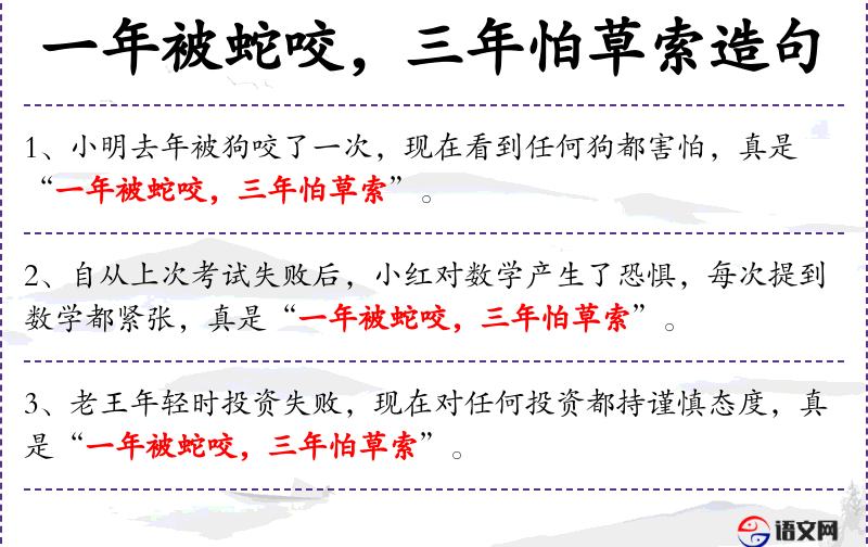 - 可以改写为:“由于年轻时的投资失败,老王现在对所有投资都非常谨慎,这就像是被蛇咬过一次,之后很长时间都害怕类似的草索。”