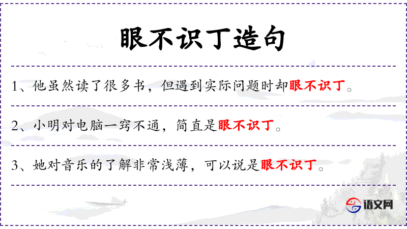 1. 【眼不识丁】 - 连最普通的“丁”字也不认识。形容一个字也不认得。
