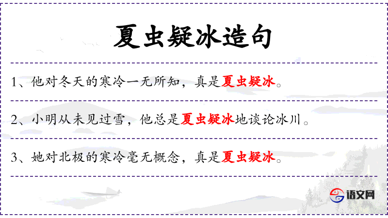 - 夏虫疑冰:成语,比喻对不了解的事物产生怀疑或不理解。