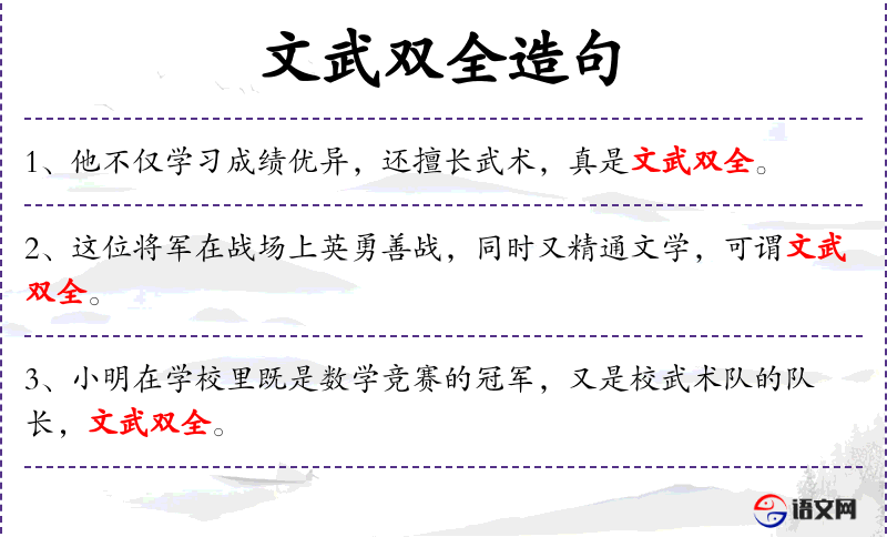 - 文武双全:成语,表示文才和武艺都很全面。