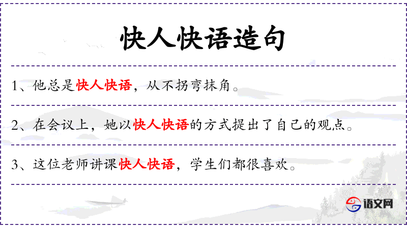 - 快人快语:形容说话速度快,直截了当。
