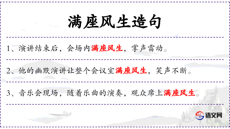 1. 【满座风生】 - 座席之间飘来清风,使同座者都能感到。形容来客神气不凡。光彩动人。