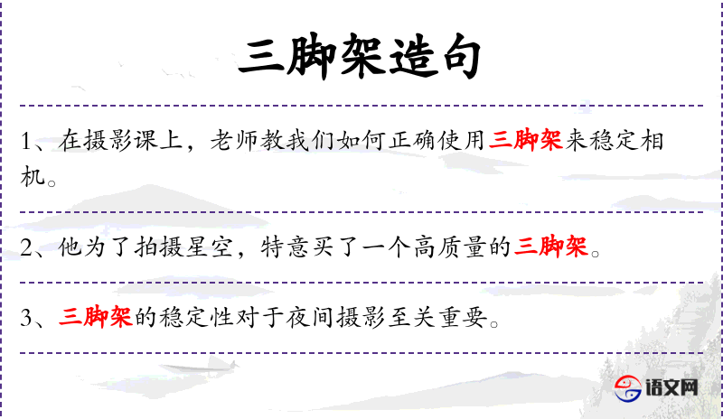 2. 【三脚架】 - 有三个支柱的架子,有的可折合﹑伸缩,多用于安放和使用照相机﹑测量仪器等。