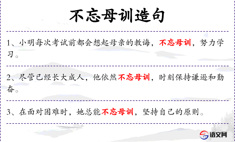 1. 【不忘母训】 - 指不忘记母亲的教诲。