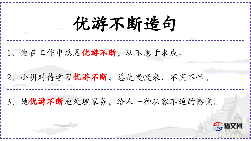 - 反义词:优游不断地 → 紧张地、急促地;从容不迫 → 慌张、匆忙。