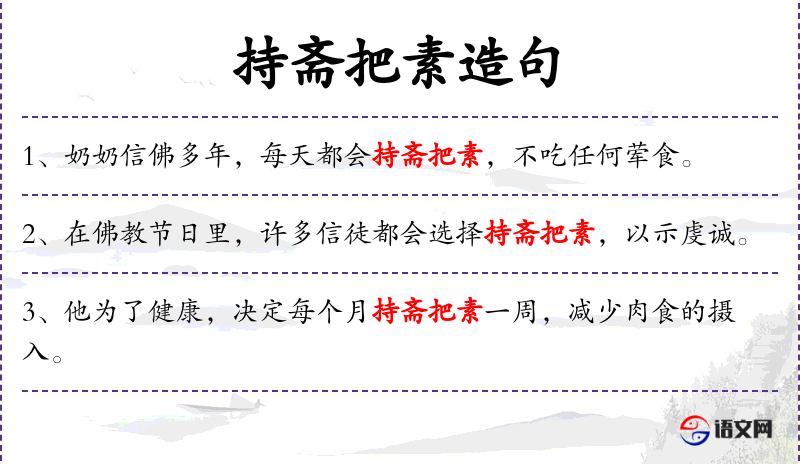 - 宾语:持斋把素一周,减少肉食的摄入