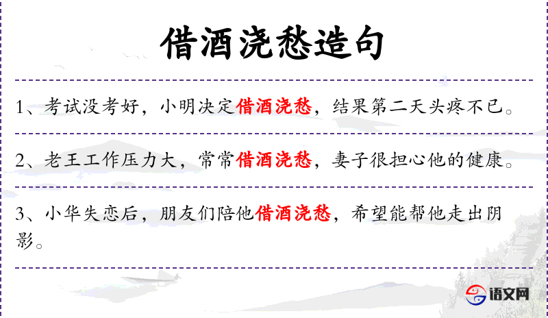 - 宾语:无直接宾语,但“借酒浇愁”中的“酒”可以视为间接宾语