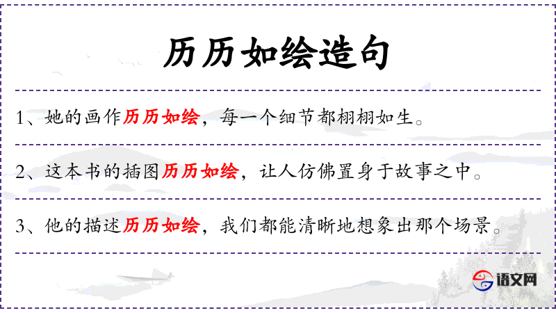 - 历历如绘:形容插图非常清晰、生动,仿佛真实绘制出来的一样。