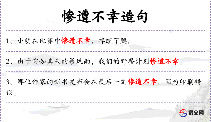 - 惨遭不幸:动词短语,表示遭受了不幸的事情。