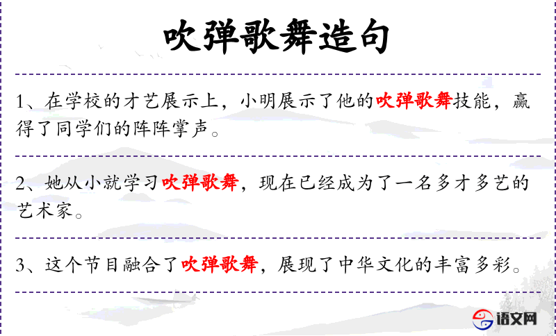 - 宾语:吹弹歌舞、传统艺术的魅力