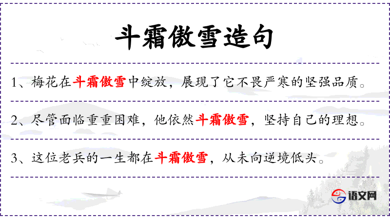 - 斗霜傲雪:形容不畏严寒,坚韧不拔。