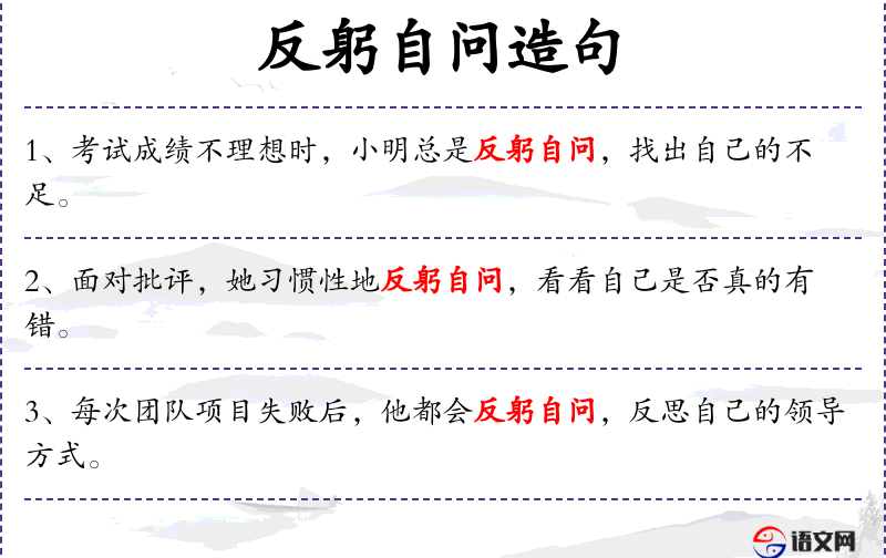 - 反躬自问:指自我反省,自我检讨。同义词:自省、反思。