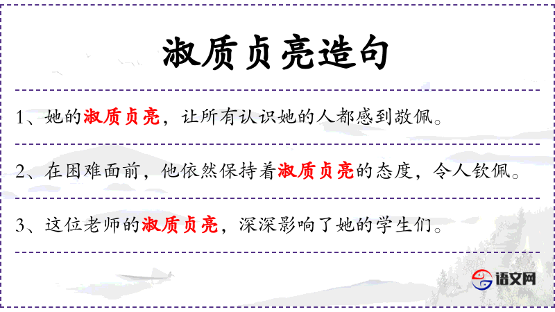 1. 【淑质贞亮】 - 淑:善良;贞:坚贞;亮:诚信质直。品质善良,为人诚信质直。