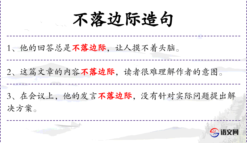 - 不落边际:形容说话或写文章不着边际,缺乏针对性。