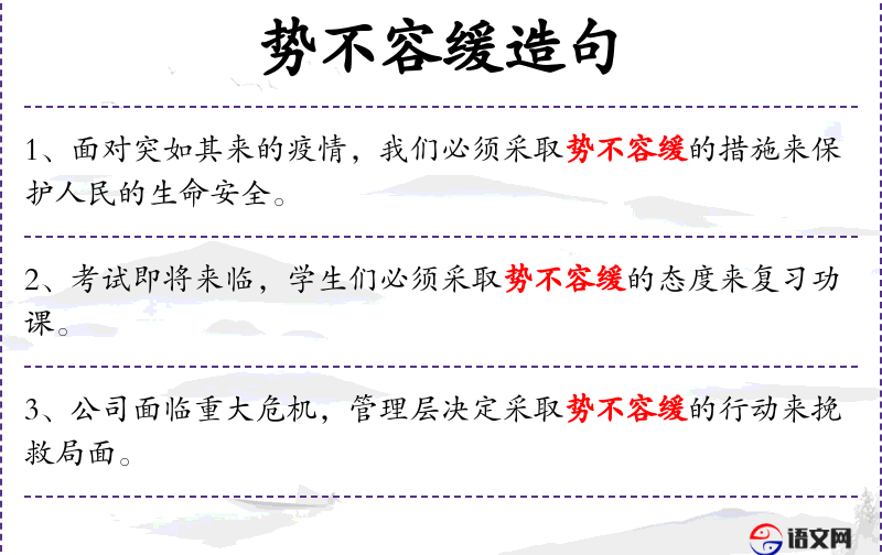 - 势不容缓:形容情况紧急,必须立即采取行动。