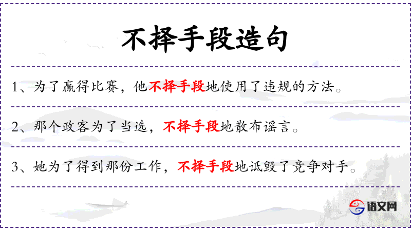 - 不择手段地:表示采取任何手段,不顾后果。