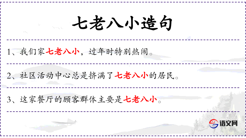 - 七老八小:形容家庭成员众多,老少皆有,是一个成语性质的表达。