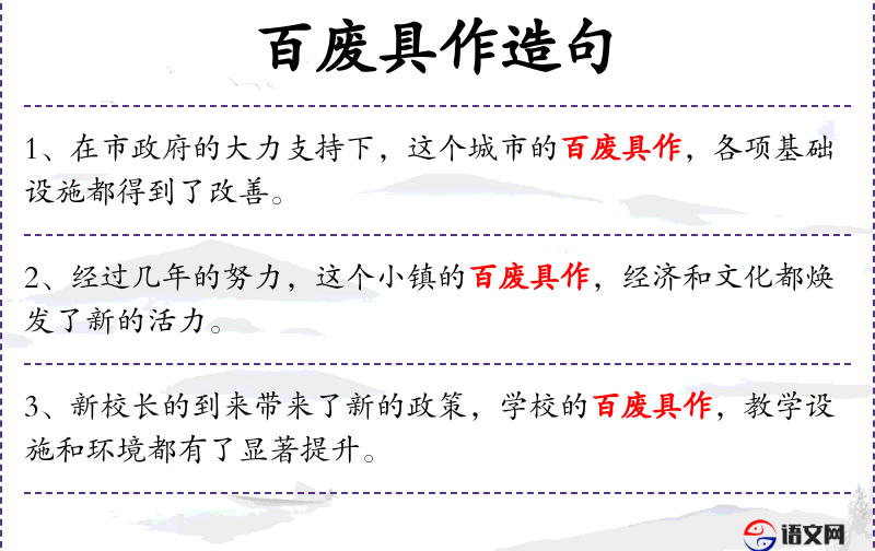 6. 【百废具作】 指一切废置的事都兴办起来。同“百废俱兴”。