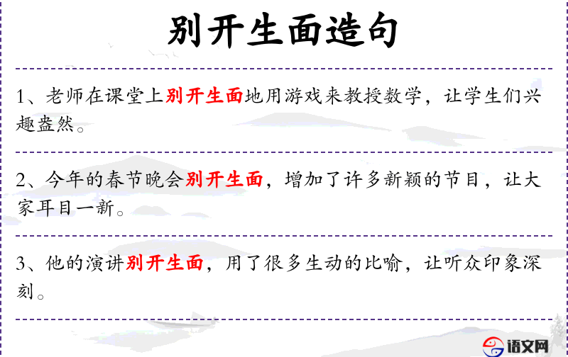 - 别开生面:形容事物新颖,与众不同。