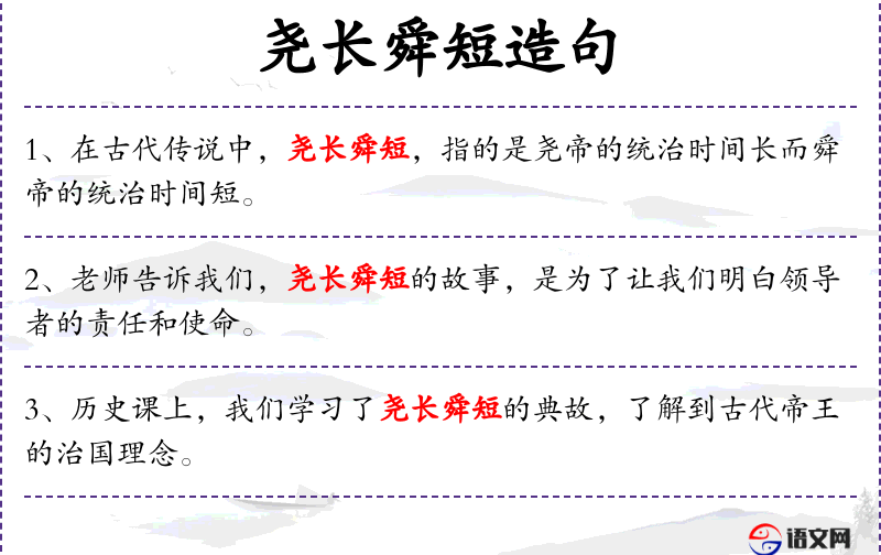 - 尧长舜短:指尧和舜两位古代**帝王,尧在位时间长,舜在位时间短。