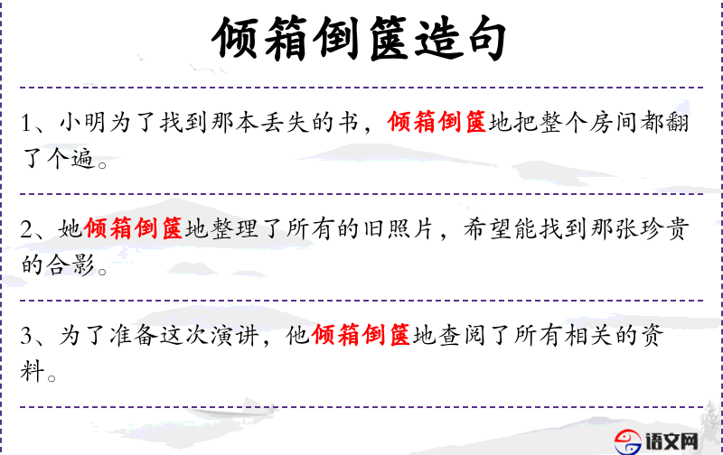 - 倾箱倒箧:这个成语源自古代,形容彻底地查找或整理东西,体现了中华文化中对细致和彻底的重视。