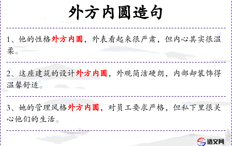 - 外方内圆:形容构图的外部形状为方形,内部为圆形