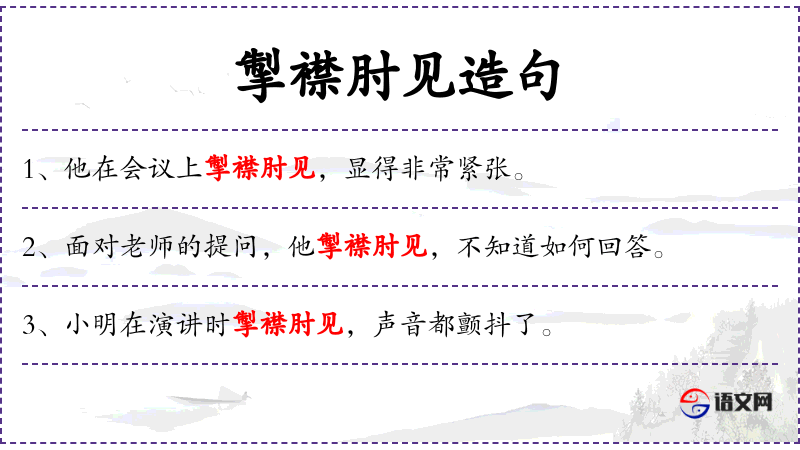 - 成语典故:掣襟肘见出自《左传·宣公十五年》,原指衣服不合身,后比喻人在某种场合显得不自然、局促。