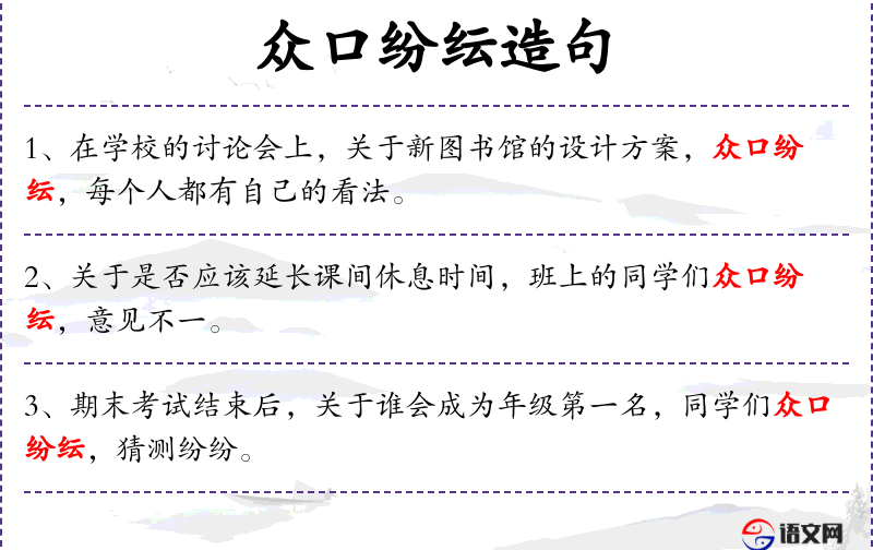 - 定语:“重新”修饰“装修” *. 并列结构:“师生们众口纷纭,各抒己见”