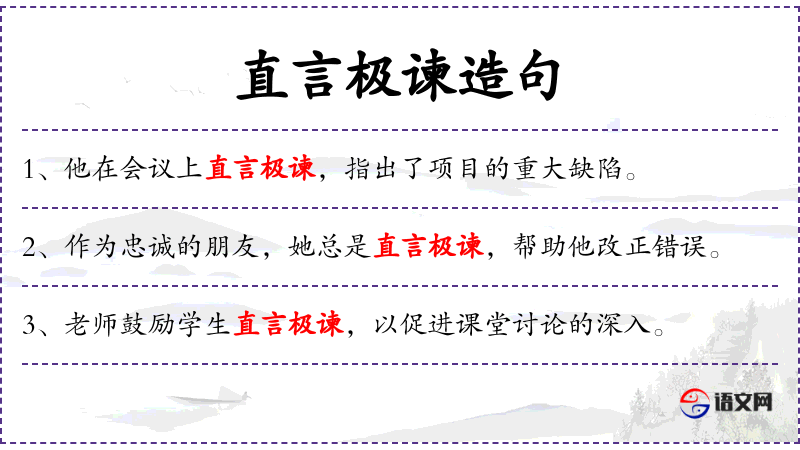 4. 【直言极谏】 - ①谓以正直的言论谏诤。古时多用于臣下对君主。②直言极谏科的省称。