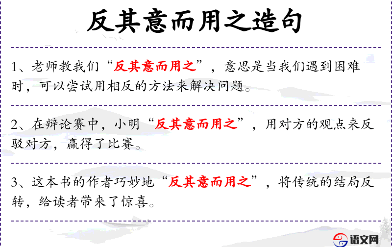1. 【反其意而用之】 其:他的;意:意义;用:使用。指按照与原来相反的意思去引用或使用词语、典故等。也用来指文艺创作等有创新或突破前人的束缚。