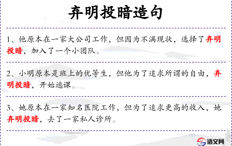- 弃明投暗:成语,比喻放弃光明正大的职业,转而从事不为人知的职业。