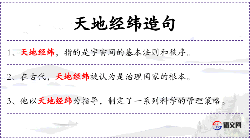 - 天地经纬:指宇宙的秩序和规律,常用来比喻治理国家的原则和方法。